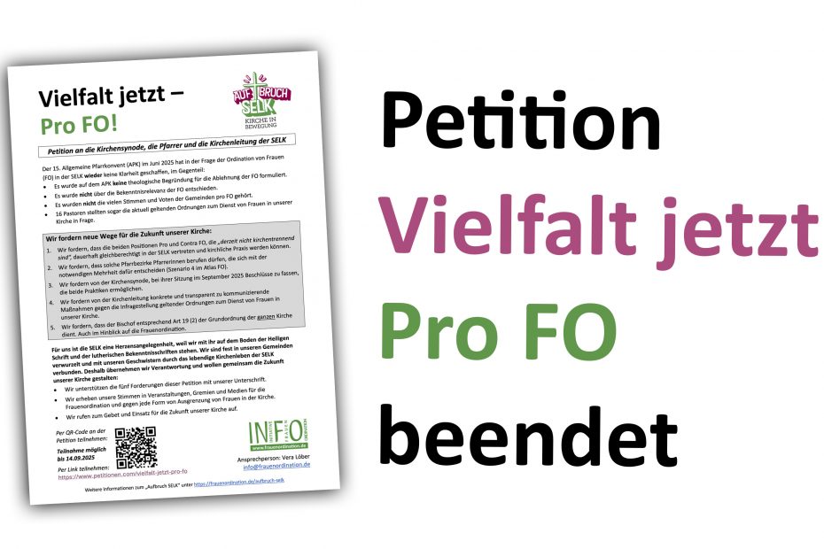 In der Zeit vom 31.07. bis 14.09.2025 haben 1.540 Kirchglieder* der Selbständigen Evangelisch-Lutherischen Kirche (SELK) die Petition „Vielfalt jetzt – Pro Frauenordination in der SELK“ unterzeichnet. Die… Weiterlesen »Petition „Vielfalt jetzt – Pro Frauenordination“ mit breiter Zustimmung beendet
