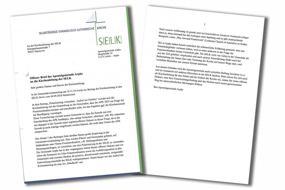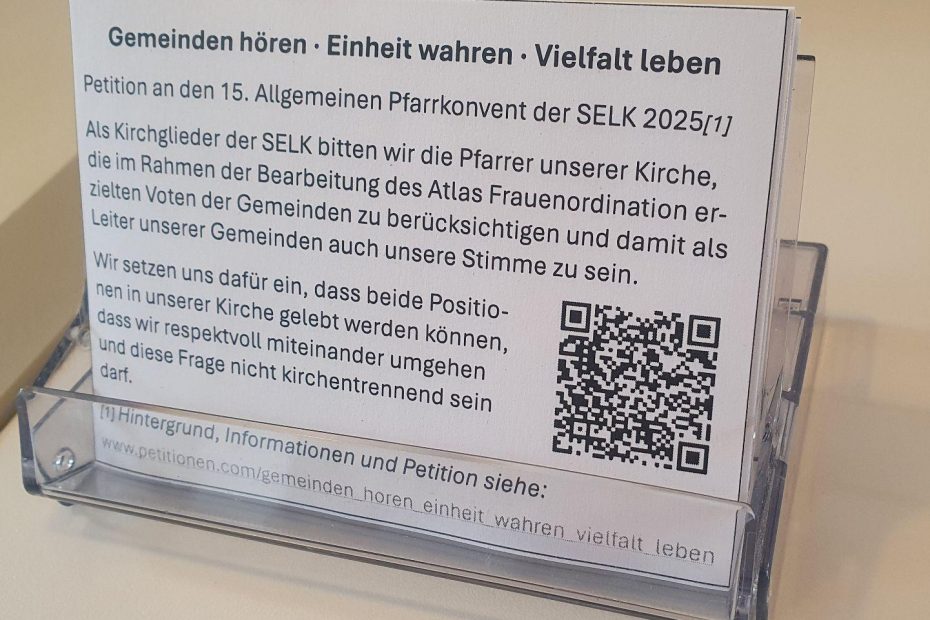 In Vorbereitung auf den 15. Allgemeinen Pfarrkonvent (APK) der Selbständigen Evangelisch-Lutherischen Kirche (SELK), der vom 23. bis 27. Juni 2025 in Hofgeismar stattfindet, haben engagierte… Weiterlesen »Petition an den APK: Gemeinden, Einheit, Vielfalt