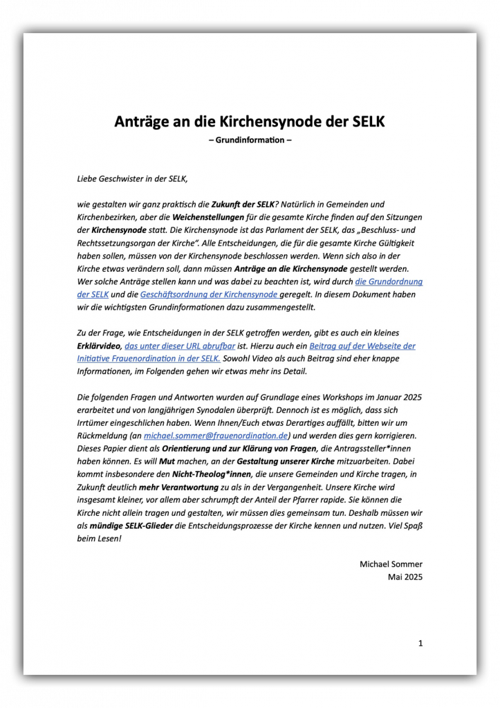 Es geht in diesem Leitfaden zum Beispiel darum, wer eigentlich Anträge an die Kirchensynode stellen darf, welche Form sie haben müssen und um welche Themen es gehen kann. Dabei wird stets auf die entsprechenden Stellen in der Grundordnung der SELK bzw. der Geschäftsordnung der Kirchensynode verwiesen, um die Aussagen zu belegen. An einigen Stellen geht der Text in Form von Exkursen etwas in die Tiefe, z.B. wenn es um das Thema „Abgrenzung der Aufgaben von Allgemeinem Pfarrkonvent und Kirchensynode“ geht – seit vielen Jahren ein kontrovers diskutiertes Thema in der SELK. Der Text wurde von erfahrenen Synodalen auf sachliche Richtigkeit überprüft, dennoch ist es natürlich möglich, dass sich Irrtümer eingeschlichen haben bzw. etwas ergänzt werden kann oder sollte. Entsprechende Hinweise werden gern in eine Neufassung eingearbeitet und sollen an michael.sommer@frauenordination.de gerichtet werden.